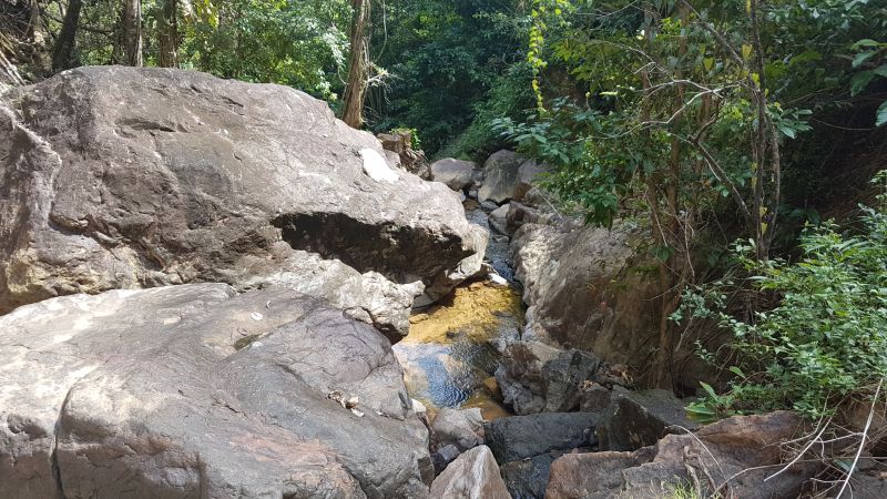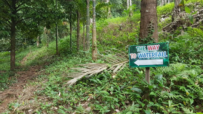 Now we’re getting a bit more adventurous. This waterfall does exist – despite it not being marked on any print map of the island. And you’ll get a real sense of being in the jungle, away from civilisation when you are there. Following the inland track from the 7-eleven at the south end of the beach will, after 15 minutes walk along a dirt track, bring you to a few small bungalows which are available for long-term rent. on the way you’ll see a couple of signs for the waterfall.