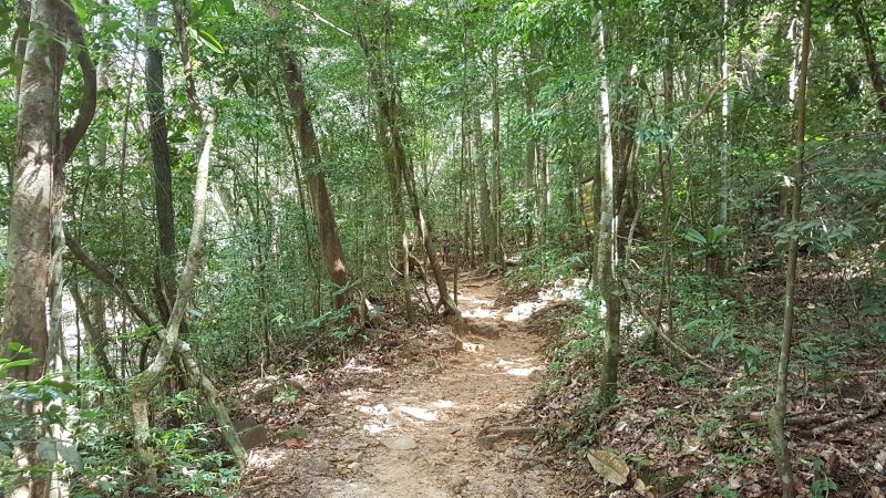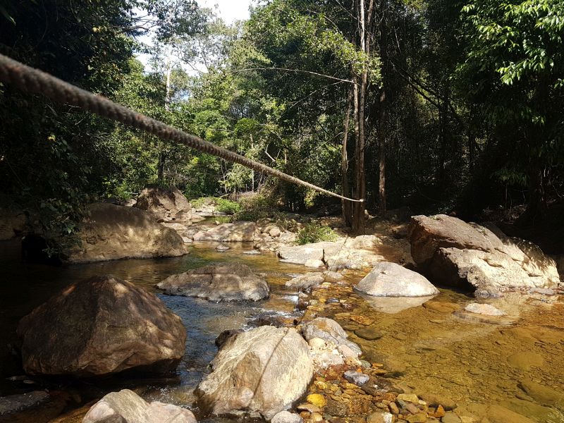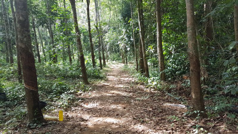 The left hand path soon crosses the river and you enter a filed of tall grass. You have to follow a very narrow path through the grass, which runs parallel to the river. Soon this becomes a much wider path through a rubber plantation. It’s flat all the way to the river. An easy walk.