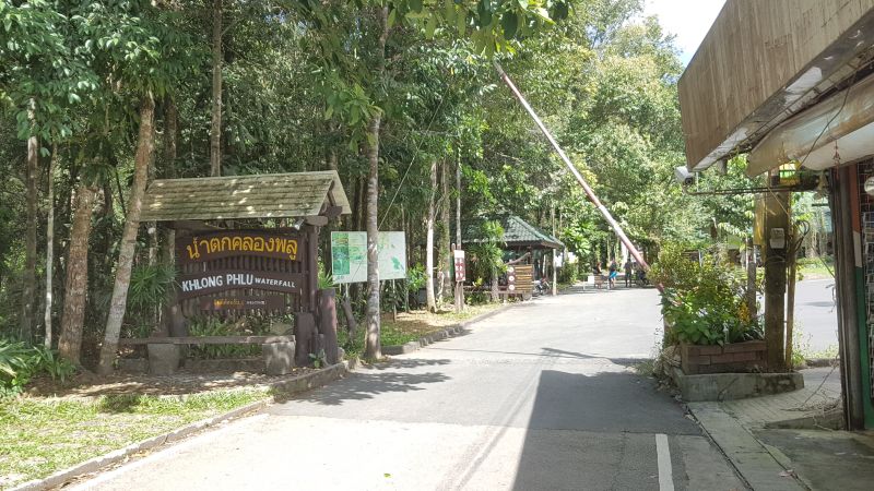 A few hundred metres further you pass the police station, on the left and then come to the large government office complex with a football pitch by the roadside. Look for the blue sign – in English – to Klong Nonsi Waterfall. Follow this road inland around the back of the offices and you’ll end up parking by the river.