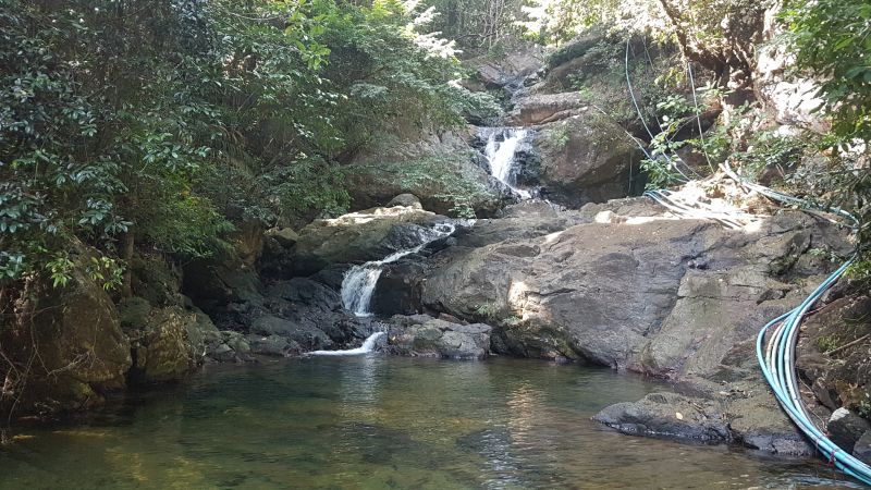 This isn’t a spectacular waterfall. There are a lot of levels but most are small. The first part of the trail to the waterfall is easy to follow, along the left hand side of the river. It’s a narrow path, with a couple of sections that require clambering up rocks, using a guide rope. A small dam has been built at Level 2, so you can swim there but Level 4 is the best place to stop. It has the largest pool and is where most people will stop their adventure. At this point, the path continues on the right hand side of the river. Again you’ll be following water pipes which have been laid to bring water to farms and homes in the valley.