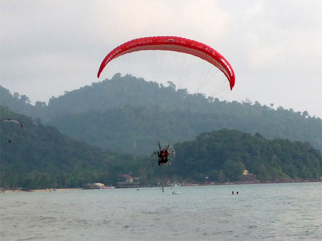 Koh Chang is starting to gewt a reputation as a place to visit if you have a microlight or paramotor. Microlight planes from Pattaya often fly down here and land at the airstrip in Klong Prao and in early April it was the turn of a group of paramotor enthusiasts from Chiang Mai who loaded 9 or 10 paramotors into a truck and drove down here for a couple of days flying.
